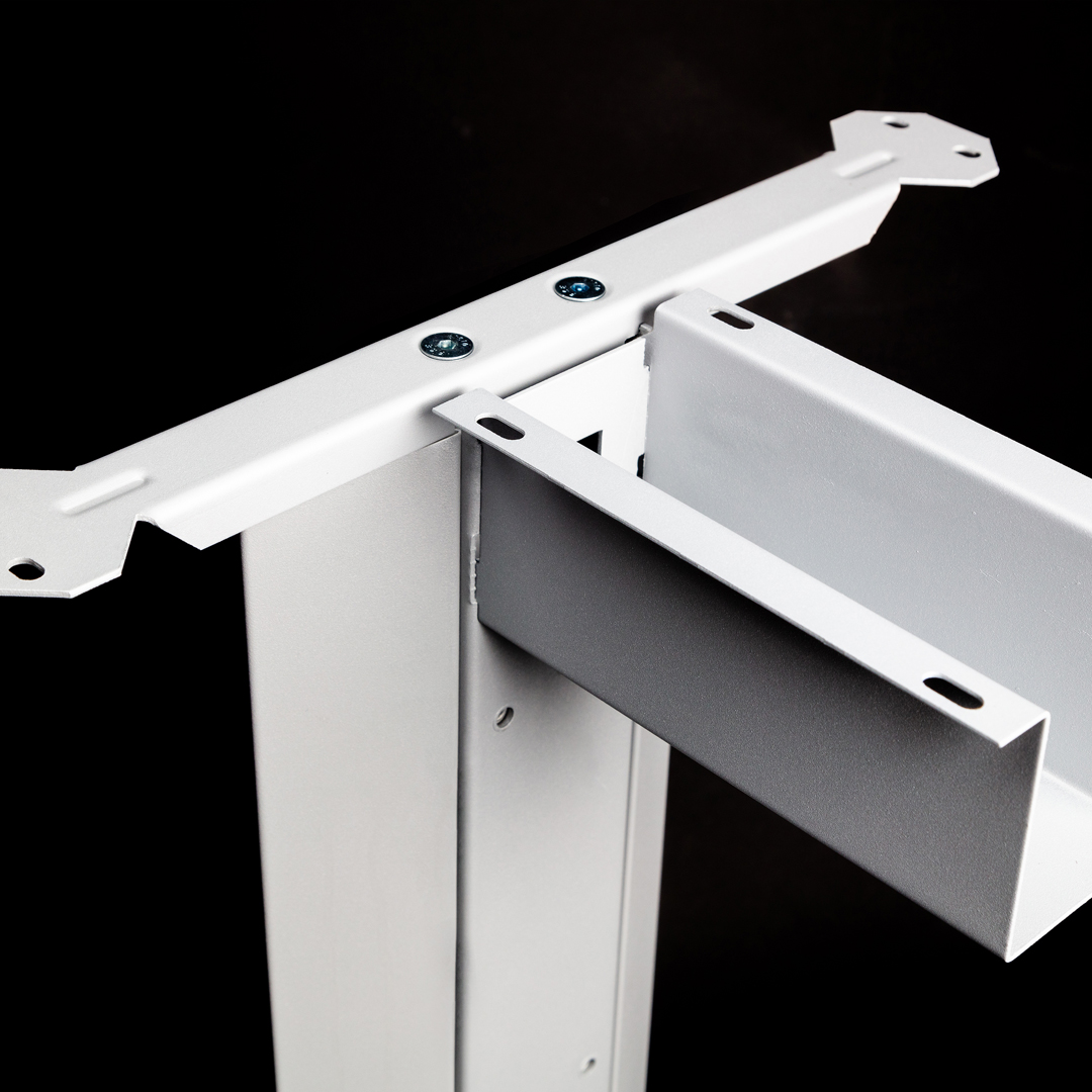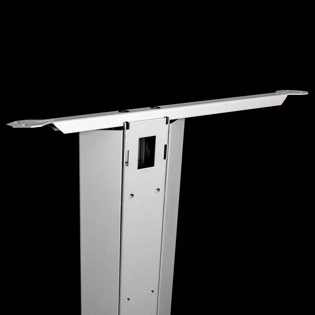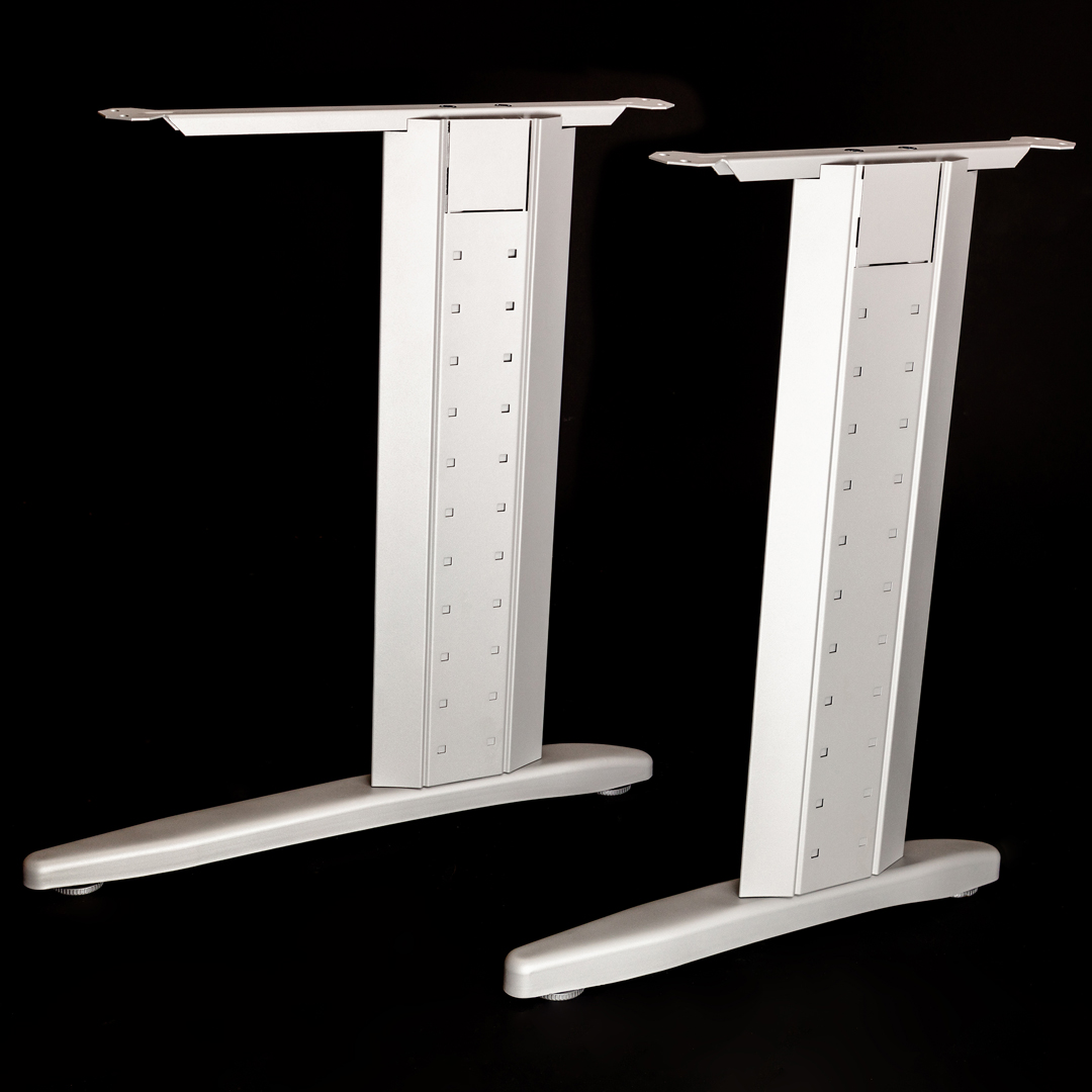 Estructura metálica clásica. Válida para larguero extensible o faldón de aglomerado. Robusta con espesor de 2 mm en zonas de esfuerzo. Se sirve desarmada. Montaje mediante 4 tornillos M8. Electrificación vertical y horizontal. Pie de estampación ergonómico y robusto en acero de 2,5 mm. Niveladores para regular 20 mm la altura o compensar irregularidades del suelo. Tratamiento del acero: desengrase y fosfatado. Recubrimiento: Polvo electrostático al horno. Color estándar: Gris 9006 semimate texturado.