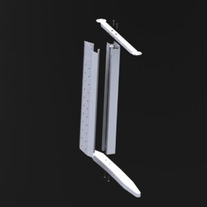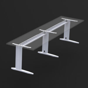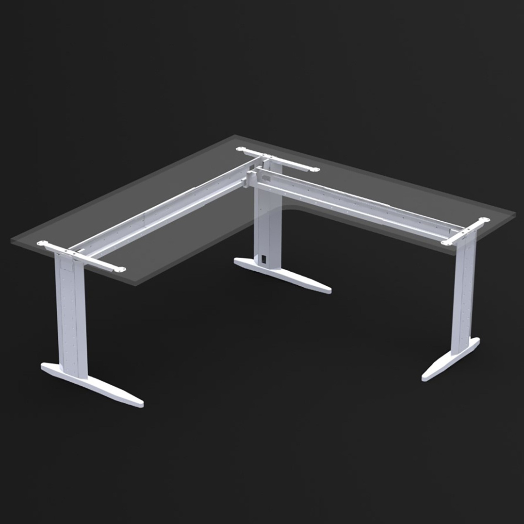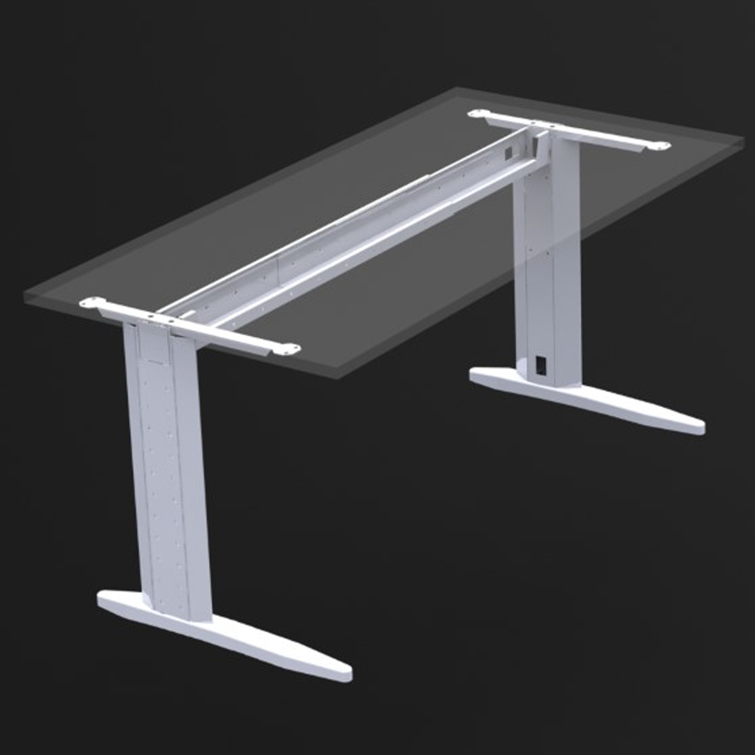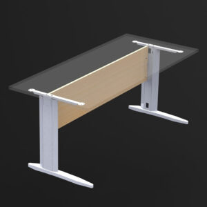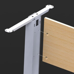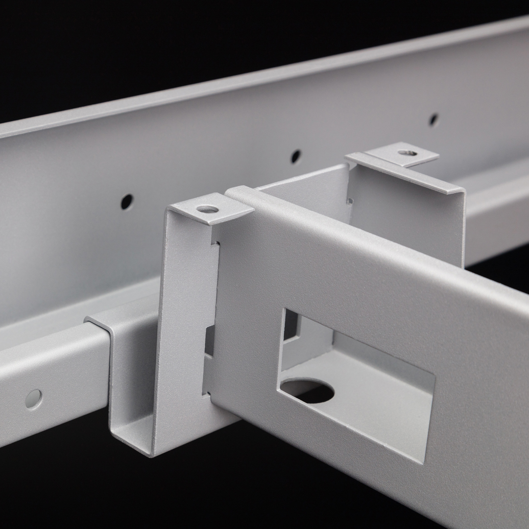 Estructura metálica clásica. Válida para larguero extensible o faldón de aglomerado. Robusta con espesor de 2 mm en zonas de esfuerzo. Se sirve desarmada. Montaje mediante 4 tornillos M8. Electrificación vertical y horizontal. Pie de estampación ergonómico y robusto en acero de 2,5 mm. Niveladores para regular 20 mm la altura o compensar irregularidades del suelo. Tratamiento del acero: desengrase y fosfatado. Recubrimiento: Polvo electrostático al horno. Color estándar: Gris 9006 semimate texturado.
